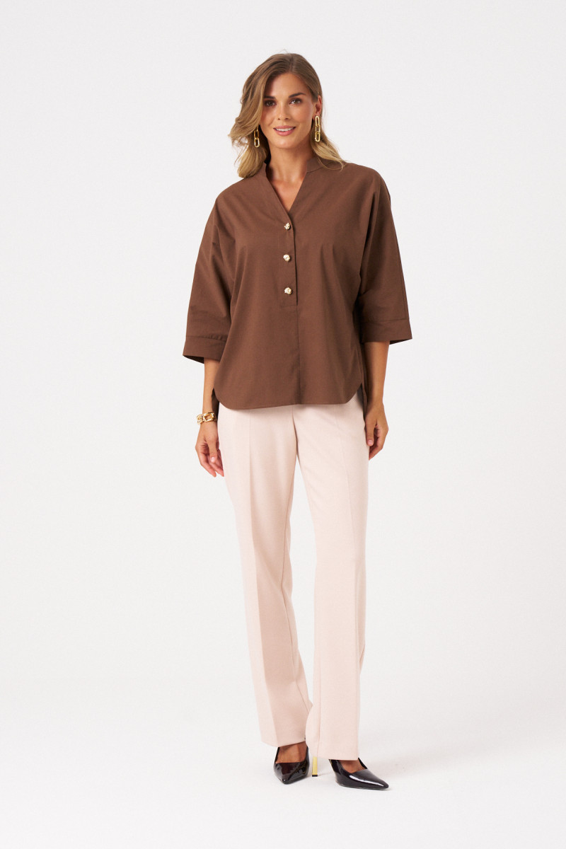 Блузка офисная свободного кроя со спущенной линией плеча. Перед с воротником-стойкой и V-образным вырезом, подчеркнутым блестящими пуговицами на центральной застежке. Блузка летняя женская украшает аккуратный закругленный низ, разрезы в боковом шве и удлиненная спинка с пришивной кокеткой и складкой. Это обеспечивает идеальную посадку на плечах.