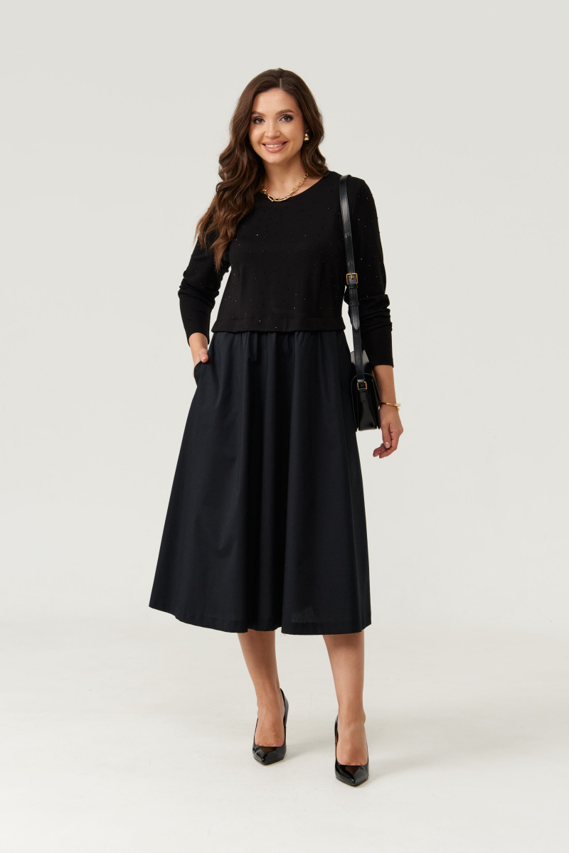 Платье женское из смесовой ткани для повседневной носки. Платье отрезное по линии талии с имитацией джемпера. Лиф переда имеет две нагрудные вытачки. Юбка платья, расширенная к низу. Низ юбки из другого материала. Переднее полотнище юбки имеет два кармана с листочкой и две складки, а также средний шов. Заднее полотнище юбки имеет небольшую сборку по линии талии. В боковых швах по низу изделия имеется вставка на резинке. Горловина чуть расширенная. Рукава втачные, длинные. Длина платья миди. Стильное платье черного оттенка станет отличным вариантом для вашего времяпровождение. В данном платье вам будет очень комфортно, а также оно отлично будет выглядеть на любой фигуре.