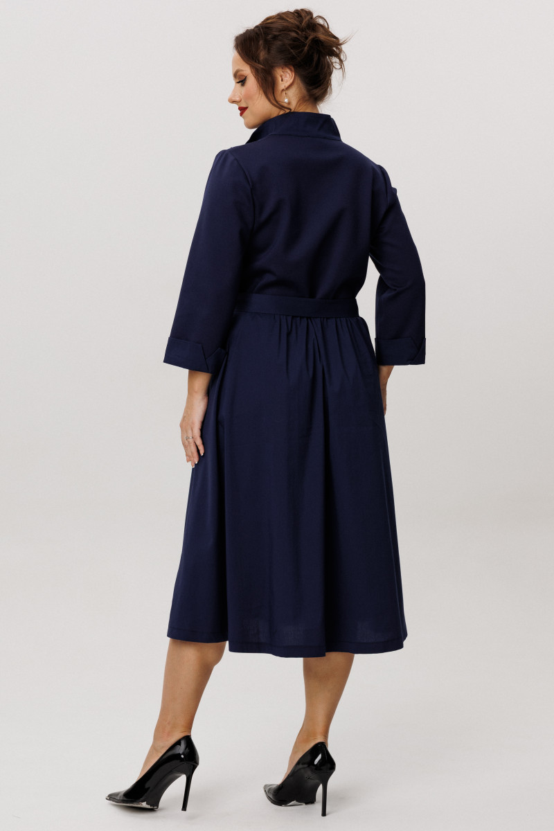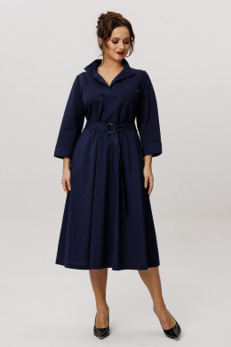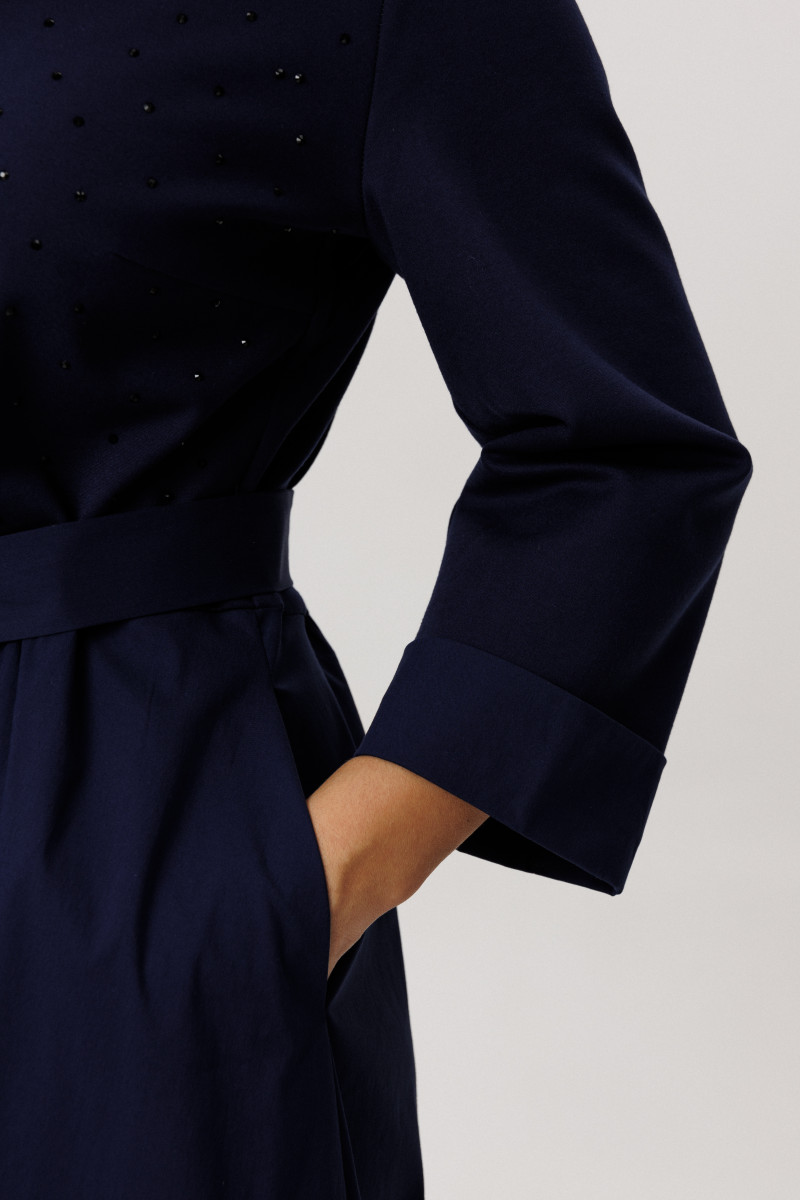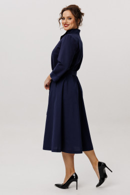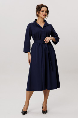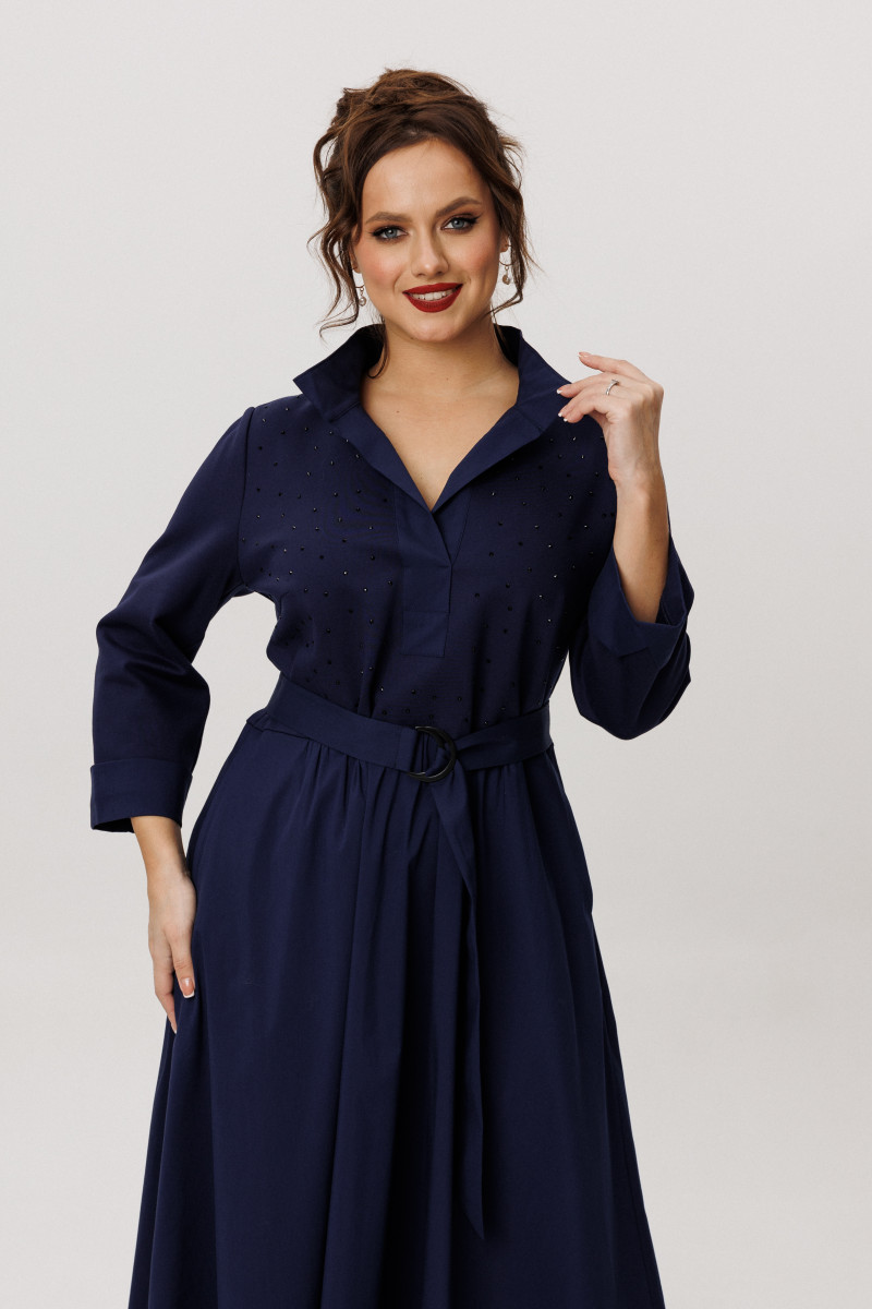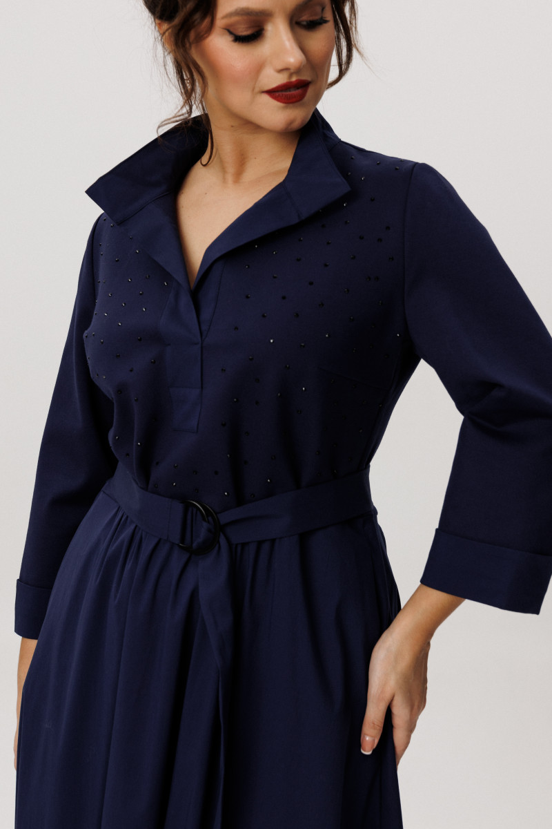 Платье женское из смесовой ткани для повседневной носки. Платье отрезное по линии талии с небольшой сборкой. Лиф переда украшен декоративными стразами, что придаёт данному платье определенный шарм. Лиф переда имеет две нагрудные вытачки. Юбка платья, расширенная к низу. Низ юбки из другого материала. В боковых швах имеются потайные карманы. Горловина обработана планкой в нахлест из другой ткани, горловина V-образная. Рукава втачные, длинные, низ рукава обработан отлетной манжетой из другой ткани. Платье с регулирующим поясом, за счет чего вы можете регулировать область прилегания в талии. Длина платья миди. Стильное платье синего оттенка станет отличным вариантом для вашего времяпровождение. В данном платье вам будет очень комфортно, а также оно отлично будет выглядеть на любой фигуре.