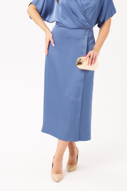 Платье женское из струящейся ткани с блеском для повседневной и торжественной носки. Платье полуприлегающего силуэта. Платье отрезное по линии талии. Лиф переда имеет средний шов и складки. Лиф спинки имеет складки и средний шов с потайной застежкой молнией. Горловина V-образная. Рукава цельнокроеные, короткие. Линия плеча чуть спущена. Юбка платья, расширенная к низу. Переднее полотнище юбки имеет складки. Заднее полотнище юбки со средним швом и вытачками. Платье длиной макси. Элегантное платье в тёмно-голубом цвете прекрасный вариант для торжественного случая.