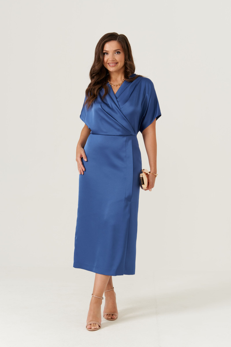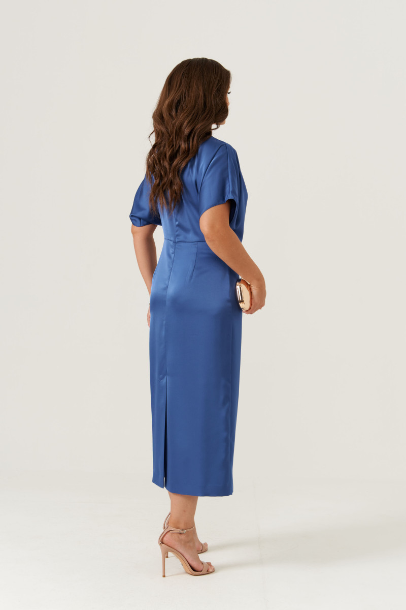 Платье женское из струящейся ткани с блеском для повседневной и торжественной носки. Платье полуприлегающего силуэта. Платье отрезное по линии талии. Лиф переда имеет средний шов и складки. Лиф спинки имеет складки и средний шов с потайной застежкой молнией. Горловина V-образная. Рукава цельнокроеные, короткие. Линия плеча чуть спущена. Юбка платья, расширенная к низу. Переднее полотнище юбки имеет складки. Заднее полотнище юбки со средним швом и вытачками. Платье длиной макси. Элегантное платье в тёмно-голубом цвете прекрасный вариант для торжественного случая.