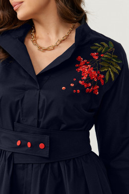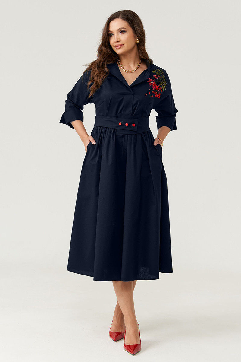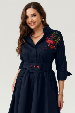 Платье женское из хлопковой ткани для повседневной носки. Без подкладки. Платье полуприлегающего силуэта. Платье отрезное по линии талии и имеет небольшую сборку. Перед имеет две нагрудные вытачки, а также дизайнерскую вышивку в виде веточки рябины. В боковых швах располагаются прорезные карманы. Горловина обработана втачной планкой с нахлестом в V-образной горловине, а также воротником-стойкой. Рукава втачные, длиной. ниже локтя. Низ рукава обработан отлетной манжетой. Юбка платья расширенная. Платье укомплектовано поясом из основной ткани изделия. Пояс со вставкой на резинке, застежка на кнопки. Длина изделия миди. Данное платье синего оттенка станет незаменимой вещью в вашем гардеробе, оно отлично будет сидеть и смотреться на любой фигуре.