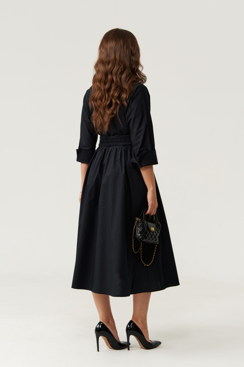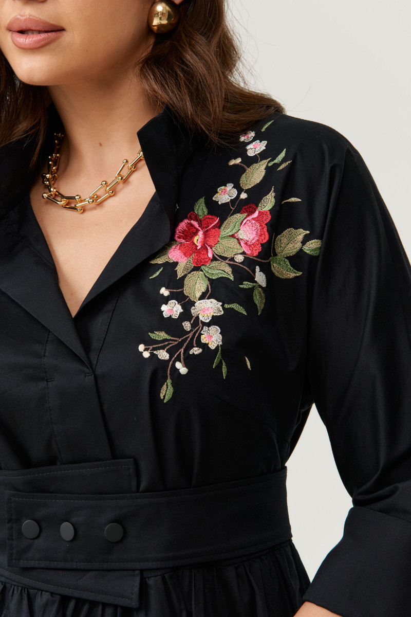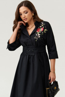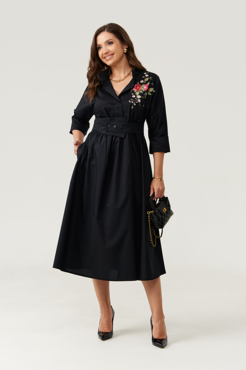 Платье женское из хлопковой ткани для повседневной носки. Без подкладки. Платье полуприлегающего силуэта. Платье отрезное по линии талии и имеет небольшую сборку. Перед имеет две нагрудные вытачки, а также дизайнерскую вышивку в виде веточки с цветочками. В боковых швах располагаются прорезные карманы. Горловина обработана втачной планкой с нахлестом в V-образной горловине, а также воротником-стойкой. Рукава втачные, длиной. ниже локтя. Низ рукава обработан отлетной манжетой. Юбка платья расширенная. Платье укомплектовано поясом из основной ткани изделия. Пояс со вставкой на резинке, застежка на кнопки. Длина изделия миди. Данное платье черного оттенка станет незаменимой вещью в вашем гардеробе, оно отлично будет сидеть и смотреться на любой фигуре.