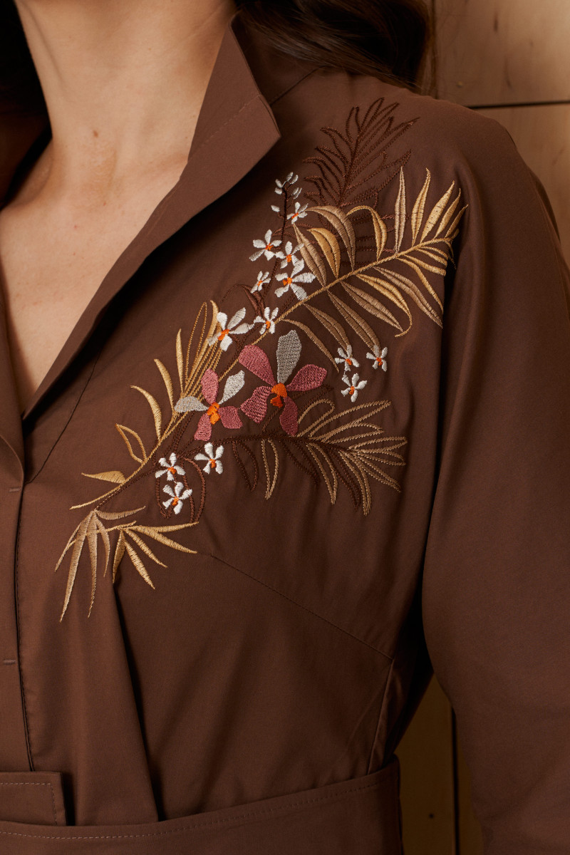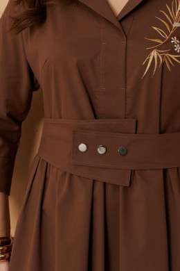 Платье женское из хлопковой ткани для повседневной носки. Без подкладки. Платье полуприлегающего силуэта. Платье отрезное по линии талии и имеет небольшую сборку. Перед имеет две нагрудные вытачки, а также дизайнерскую вышивку в виде веточек с цветочками. В боковых швах располагаются прорезные карманы. Горловина обработана втачной планкой с нахлестом в V-образной горловине, а также воротником-стойкой. Рукава втачные, длиной. ниже локтя. Низ рукава обработан отлетной манжетой. Юбка платья расширенная. Платье укомплектовано поясом из основной ткани изделия. Пояс со вставкой на резинке, застежка на кнопки. Длина изделия миди. Данное платье светло-коричневого оттенка станет незаменимой вещью в вашем гардеробе, оно отлично будет сидеть и смотреться на любой фигуре.