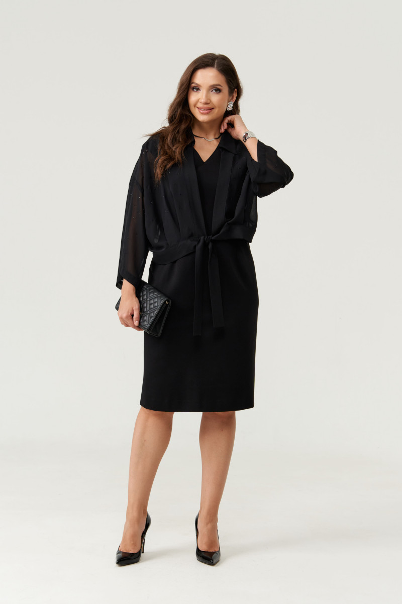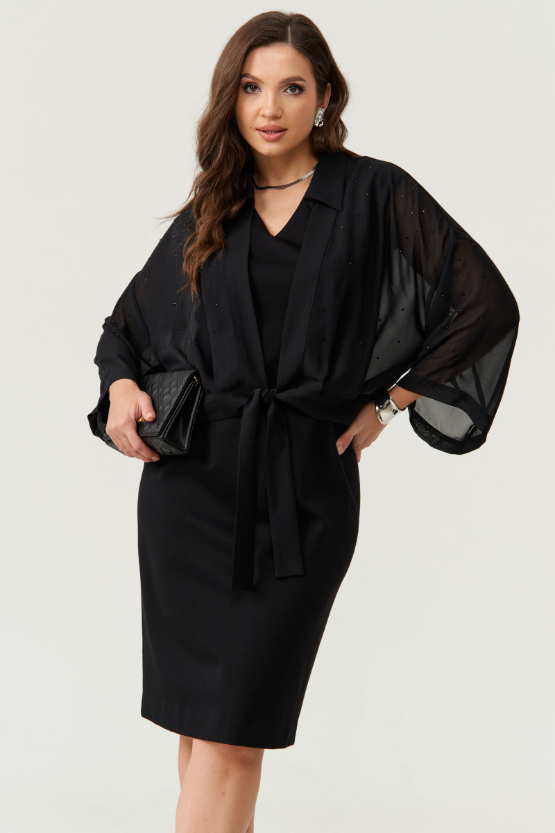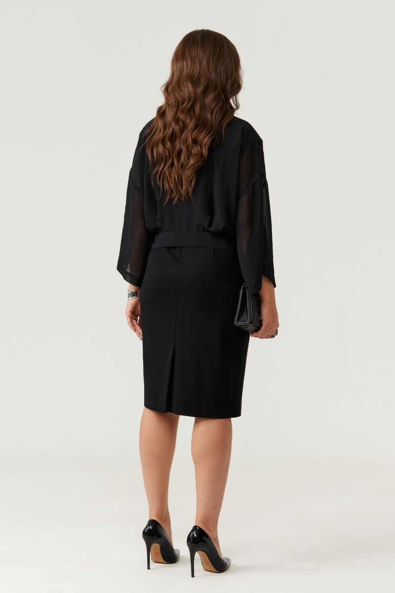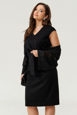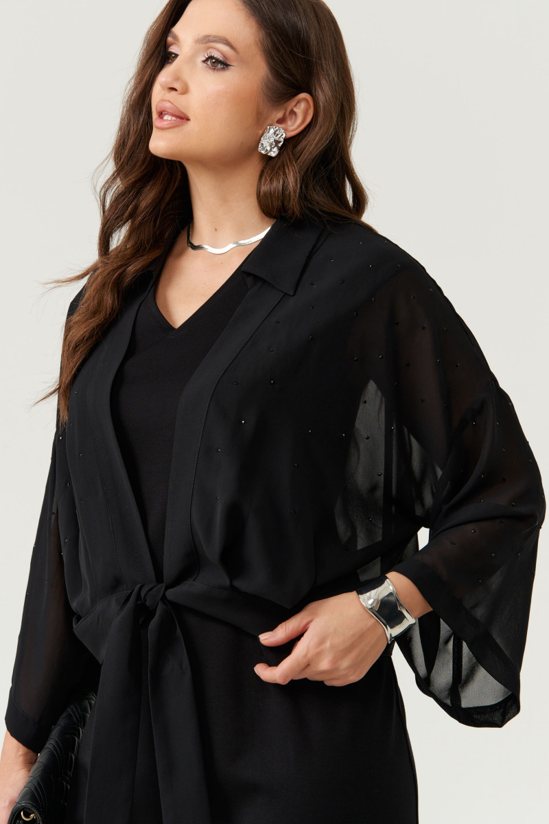 В дополнение к платью идёт блузка-болеро выполненная из струящейся прозрачной ткани. Блуза декорирована стразами, что придает ей особую элегантность и нарядность. Она застегивается на завязку, а обработанная воротником с отрезной стойкой и планкой линия борта подчеркивают аккуратность кроя. Линия плеча спущена, рукава втачные — комфортные и стильные.