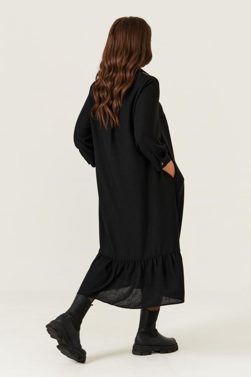 Платье женское из лёгкой ткани для повседневной носки. Платье расширенного силуэта. Горловина оформлена воротником стойкой. Рукав 3/4, низ рукава оформлен манжетой, застёгивающаяся на петлю-пуговицу. На передней части изделия дизайнерская вышивка в виде мозайки. Спинка с отрезной кокеткой, по шву сборка. Изделие с фронтальной застежкой на петли- пуговицы. По низу платья отрезной ярус на сборке. Платье на вискозной подкладке.