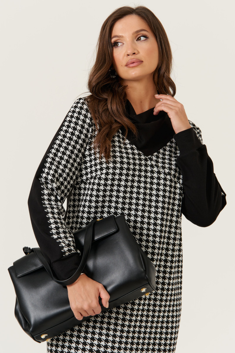 Женское платье из трикотажного полотна, идеально подходящее для повседневной носки. Модель выполнена с передом из черно-белого трикотажного материала, что создает стильный и современный образ. Передняя часть украшена подрезом от горловины в боковом шве и двумя нагрудными вытачками, которые подчеркивают фигуру и добавляют интересные детали к дизайну. Спинка со средним швом выполнена в черном цвете, что гармонично сочетается с передом и создает контрастный эффект. В боковых швах расположены разрезы, обеспечивающие комфорт и свободу движений. V-образная горловина обработана обтачкой, придающей аккуратность и завершенность neckline. Длинные втачные рукава выполнены из чёрного и чёрно-белого трикотажа: передняя часть рукава — из чёрно-белого материала, задняя — из чёрного, что создает интересный визуальный эффект. Низ рукава обработан притачной манжетой для плотного прилегания. Длина платья — макси, что делает его элегантным и универсальным вариантом для повседневных образов.