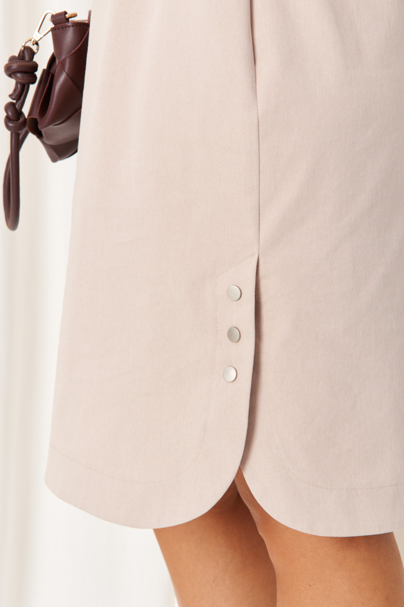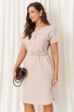 Женское платье из смесовой ткани с высоким содержанием хлопка выполнено в прямом силуэте, что обеспечивает комфорт и свободу движений. Перед платья украшен кокеткой, придающей дополнительную детализацию, а спинка также имеет кокетку и два аккуратных защипа, создающих красивый объем и форму. В боковых швах расположены потайные карманы, которые добавляют функциональности изделию, а имитация шлицы с застежкой на кнопки придает платью оригинальный и стильный вид. Горловина расширенная, обработана планкой с застежкой на кнопки, что делает изделие удобным в носке и добавляет аккуратности. Низ платья округлен, что способствует плавности силуэта. Рукава втачные, длиной чуть выше локтя, с притачной манжетой внизу, которая подчеркивает элегантность и завершенность образа. Длина платья миди. Пояс на резинке с застежкой на пряжку помогает подчеркнуть талию и обеспечивает дополнительную посадку по фигуре. Цвет платья — бежевый, который хорошо вписывается как в повседневный, так и в более формальный гардероб. Такое платье станет универсальной и стильной вещью в вашем гардеробе.
