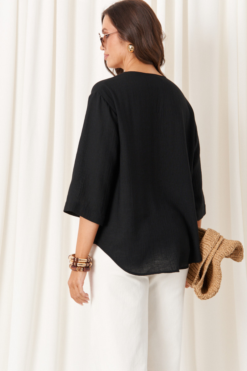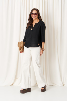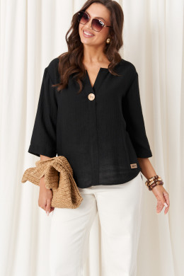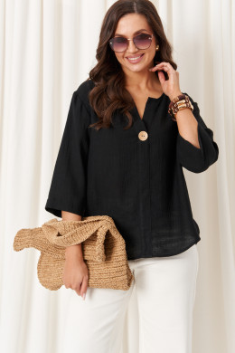 Блузка женская из хлопчатобумажной ткани прямого силуэта для повседневной носки. Перед имеет притачную планку до низа изделия с декоративной пуговицей, низ блузки полукруглый. Низ по спинке полукруглый и чуть длиннее чем перед. Горловина чуть расширена. Рукава втачные длинной чуть ниже локтя. Перед украшен пуговицей из кокоса. Очень легкая и воздушная блузка в которой вам будет очень комфортно в носке. Идеальный базовый вариант в голубом цвете.