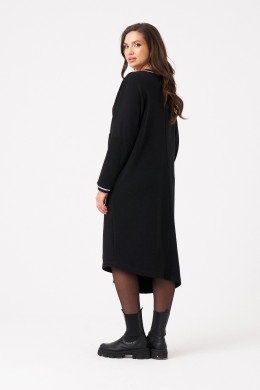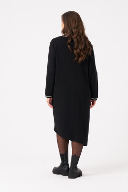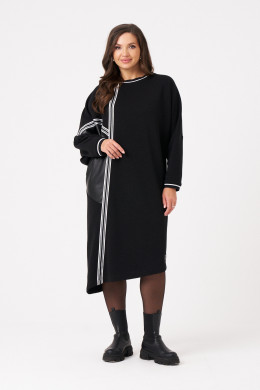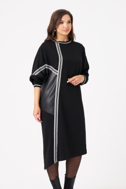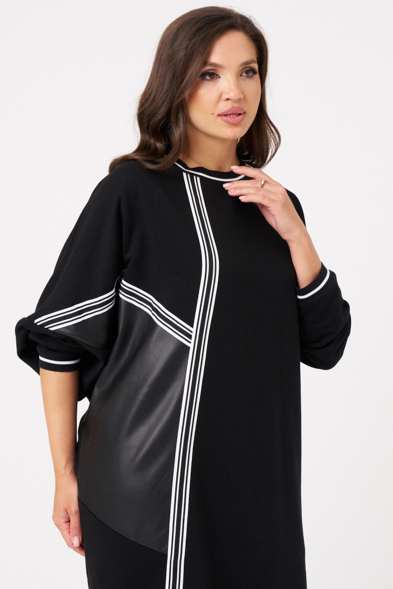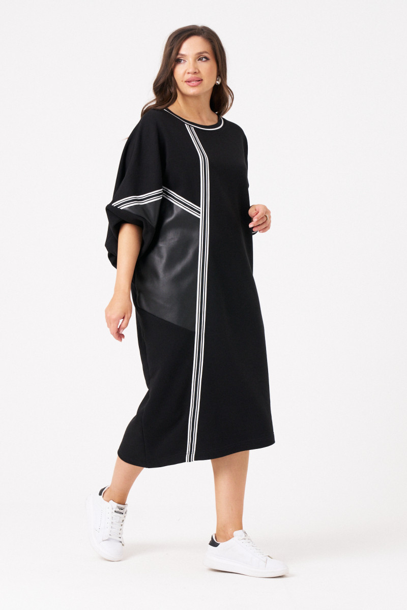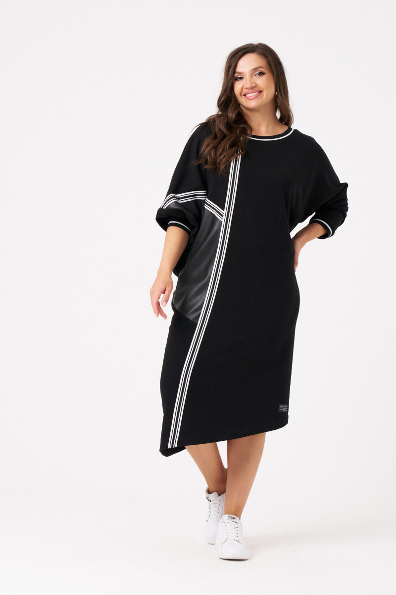 Это женское платье из хлопчатобумажного трикотажа с прямым силуэтом, предназначенное для повседневной носки. Передняя часть украшена декоративными вставками из кожаного материала и чёрно-белыми декоративными нашивками, что придает изделию стильный и современный вид. Спинка выполнена со средним швом, а горловина расширенная и обработана довязом на резинке черно-белого оттенка, обеспечивая комфорт и аккуратный внешний вид. Рукава летучая мышь с низом, обработанным притачной манжетой на резинке черно-белого оттенка, что добавляет удобства и оригинальности. Длина платья — миди, оно выполнено в чёрном цвете, что делает его универсальным и легко сочетаемым с различными аксессуарами. Интересное ассиметричное платье в больших размерах в стиле спорт шик на каждый день.