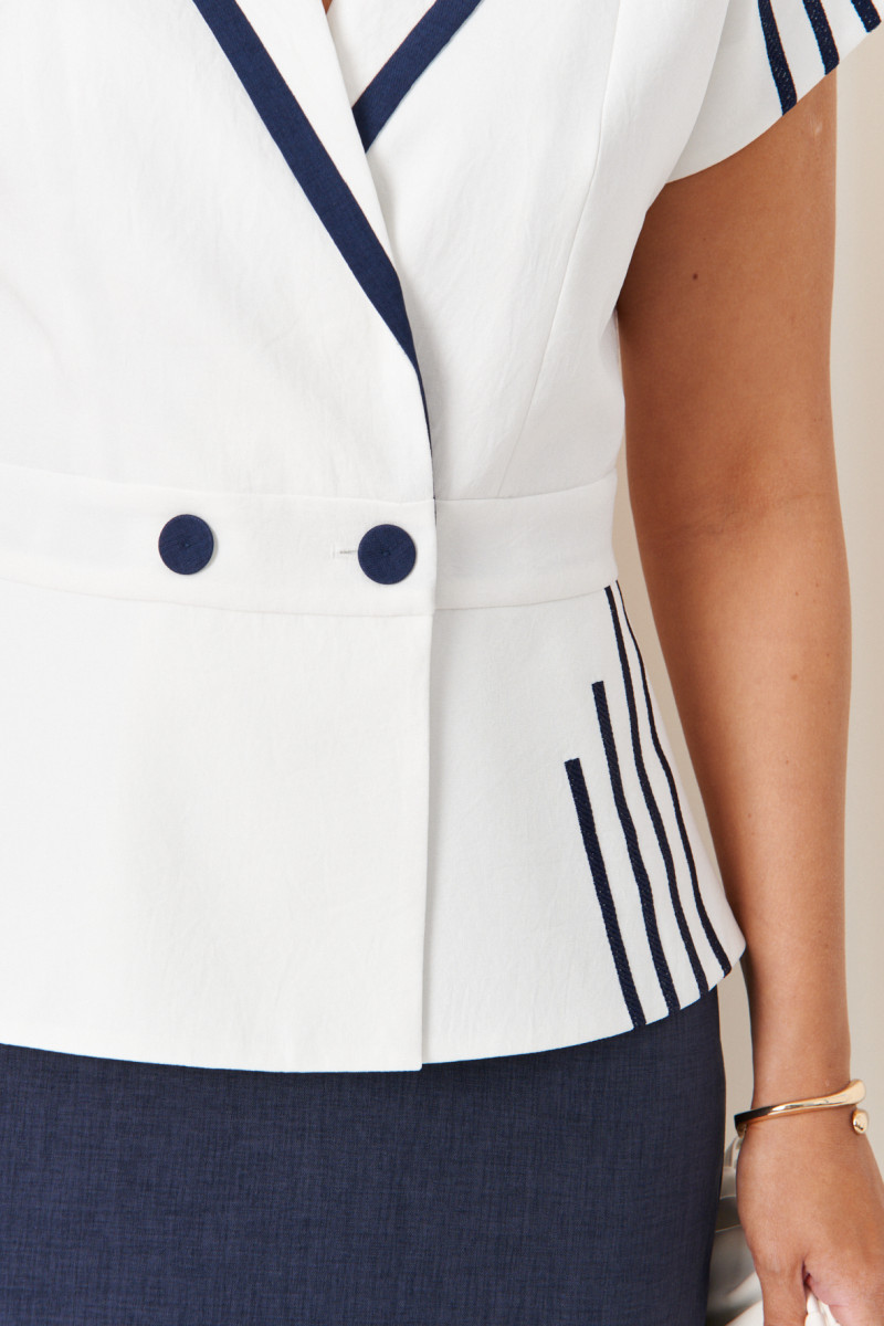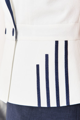 Это женский летний костюм, выполненный из лёгкой ткани с добавлением льна, который обеспечивает приятную свежесть и комфорт в тёплую погоду. В составе костюма входит жакет и прямая юбка. Жакет обладает слегка приталенным силуэтом, созданным за счёт имитации пояса, подчеркнутой отрезной линией по талии. По низу жакета расположена широкая баска, которая добавляет образу женственности и мягкости, создавая плавные линии силуэта. Модель двубортная, выполнена в молочном оттенке, с застежкой на обметанные петли и пуговицы, что придаёт жакету классический и элегантный вид. Передняя часть украшена изящной дизайнерской вышивкой в виде синих полос, которая добавляет нотки оригинальности и шарма. Также на передней части расположены два рельефа, начинающихся от плечевых швов и идущих до линии имитации пояса, что способствует визуальному удлинению и созданию стройного силуэта. Спинка оформлена со средним швом и двумя рельефами, идущими от плечевых швов до нижней линии пояса, что придает изделию дополнительную структуру и аккуратность посадки. Воротник у жакета пиджачный с декоративной вставкой из синей ткани, что служит оригинальным декоративным акцентом. Короткие цельнокроеные рукава завершены аккуратной обработкой, что создает завершённый и строгий вид. Жакет выполнен на подкладке, делая изделие более приятным к телу и повышая его качество. Юбка прямого силуэта синего оттенка, которая гармонично дополняет жакет. Верхний срез юбки обработан притачным поясом со вставкой на резинке в боковой части, что обеспечивает удобство и хорошую посадку. Переднее полотнище юбки украшено двумя талиевыми вытачками, подчеркивающими фигуру. Заднее полотнище также украшено двумя талиевыми вытачками и оснащено средним швом с разрезом, добавляющим изящество и подвижность. В среднем шве юбки расположена потайная застежка-молния, которая аккуратно скрыта и обеспечивает удобство при посадке. Общий стиль костюма сочетает лёгкость, изящество и классическую элегантность, делая его универсальным для различных светских и деловых мероприятий.
