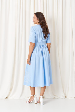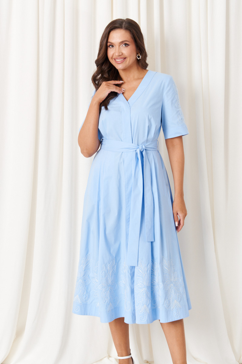 Это женское платье из высококачественной смесовой ткани с богатым содержанием хлопка, создающей приятное ощущение комфорта и легкости. Модель выполнена с отрезным по линии талии силуэтом. Лиф спинки украшен эластичной вставкой на резинке по талии, что обеспечивает идеальную посадку и комфорт при движении. Передняя часть лифа отличается двумя аккуратными защипами, придающими изделию дополнительную выразительность. Нижняя часть платья — юбка, расширенная к низу, — создает мягкую и плавную силуэтную линию, а защипы на передней полотнище добавляют объем и изюминку дизайна. В боковых швах встроены потайные карманы и шлевки по линии талии, что позволяет сочетать функциональность с эстетикой. Горловина оформлена V-образной планкой, придающей модели изящность, а застежка выполнена супатным способом на обметанных петлях и пуговицах, что обеспечивает надежность и удобство при надевании. Рукава втачные длиной до локтя украшены красивой декоративной вышивкой в виде цветов, что создает особую изюминку образа. Общий комплект завершает изысканный голубой оттенок, а длина платья — миди — подходит для разнообразных случаев, создавая элегантный и стильный облик.