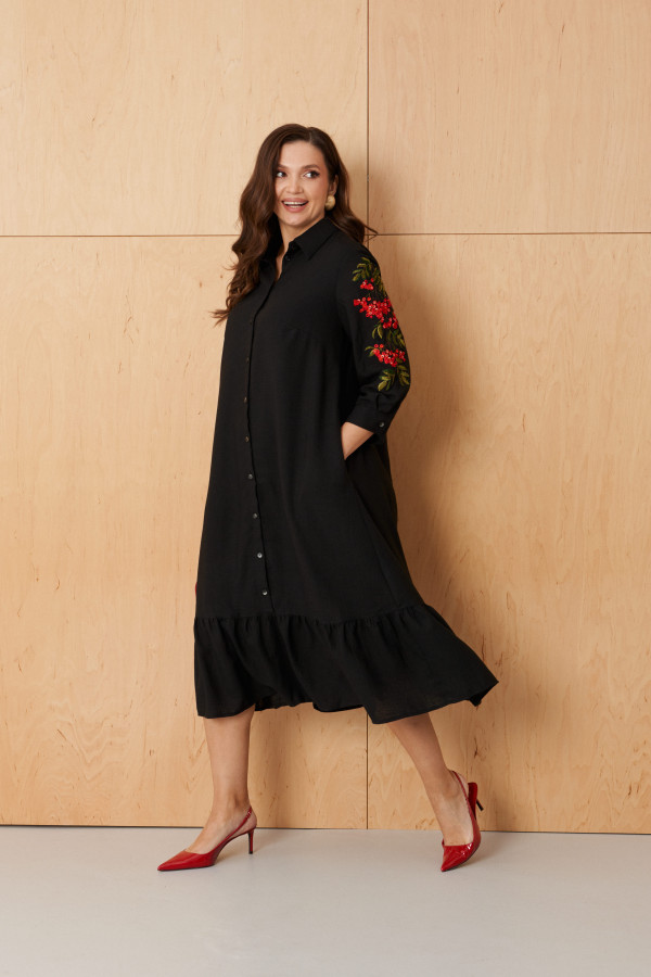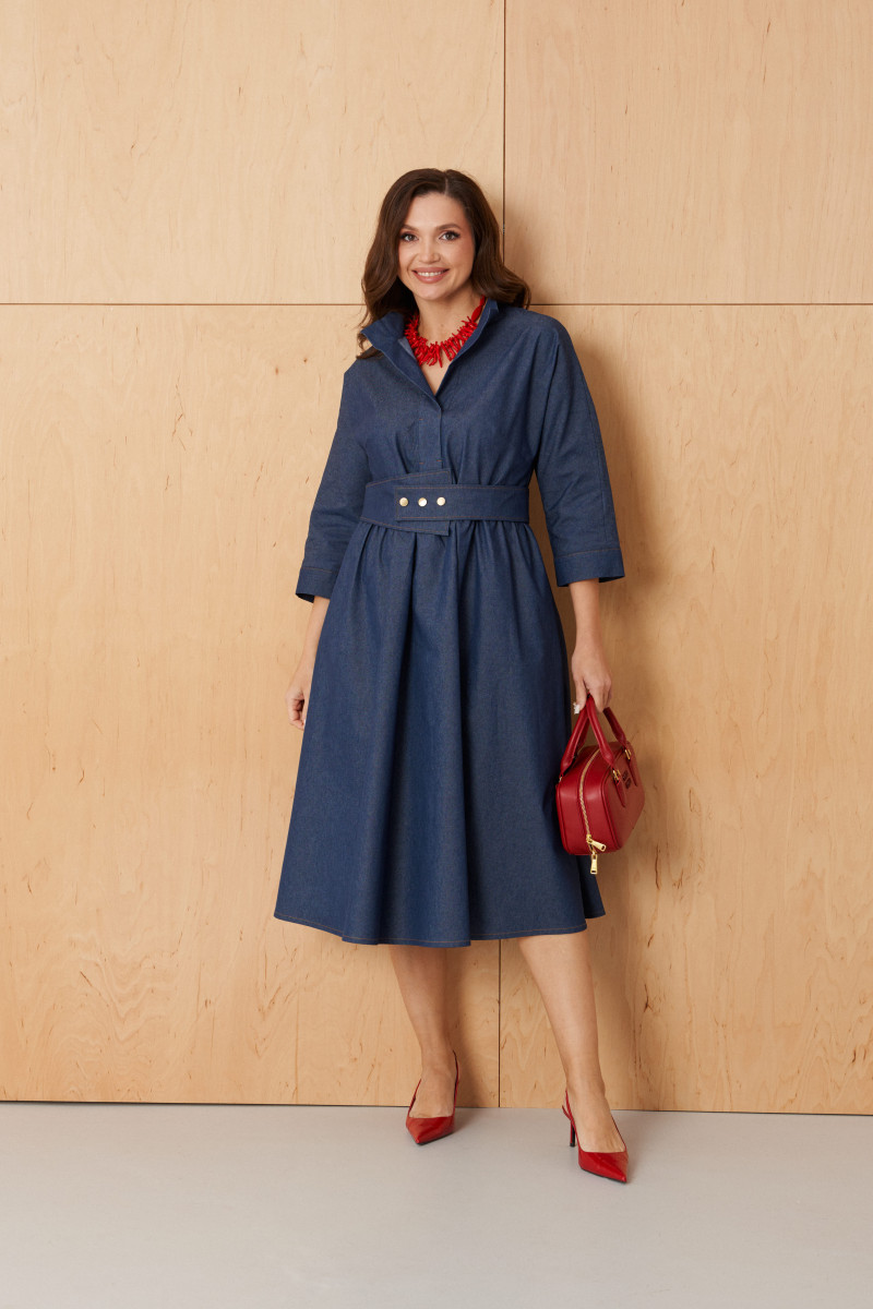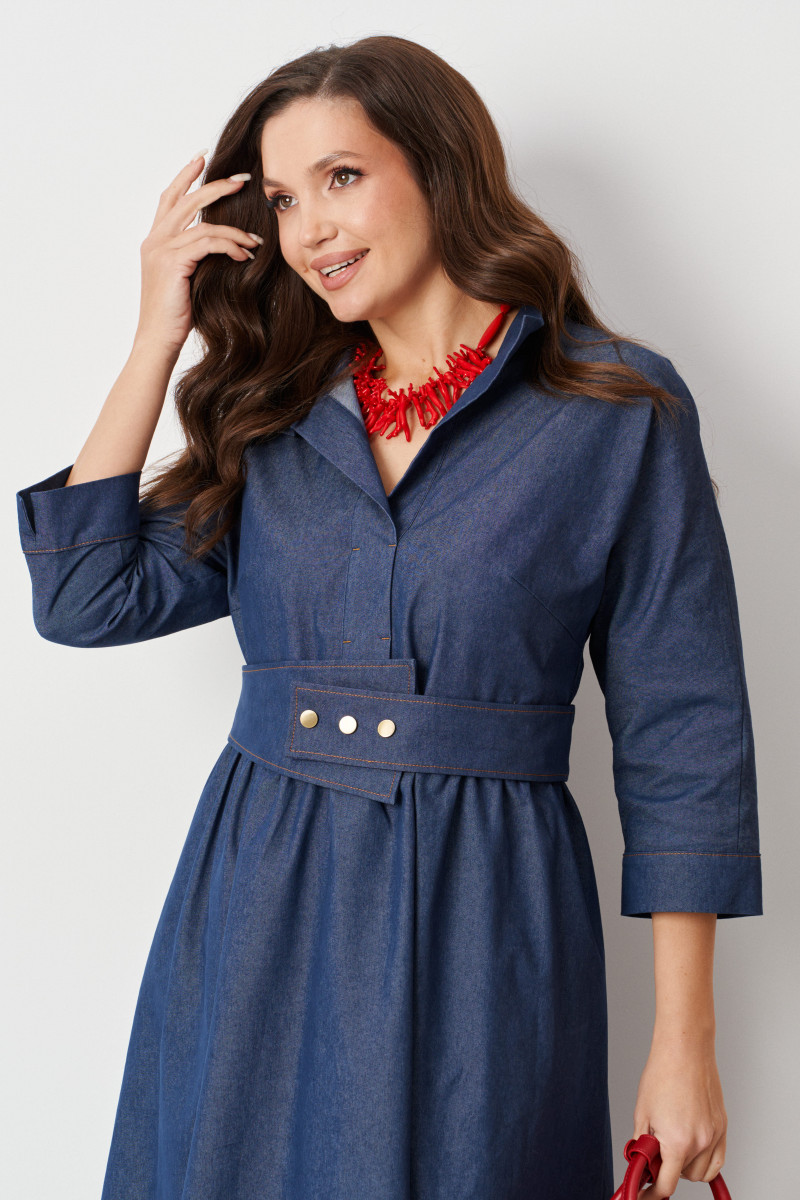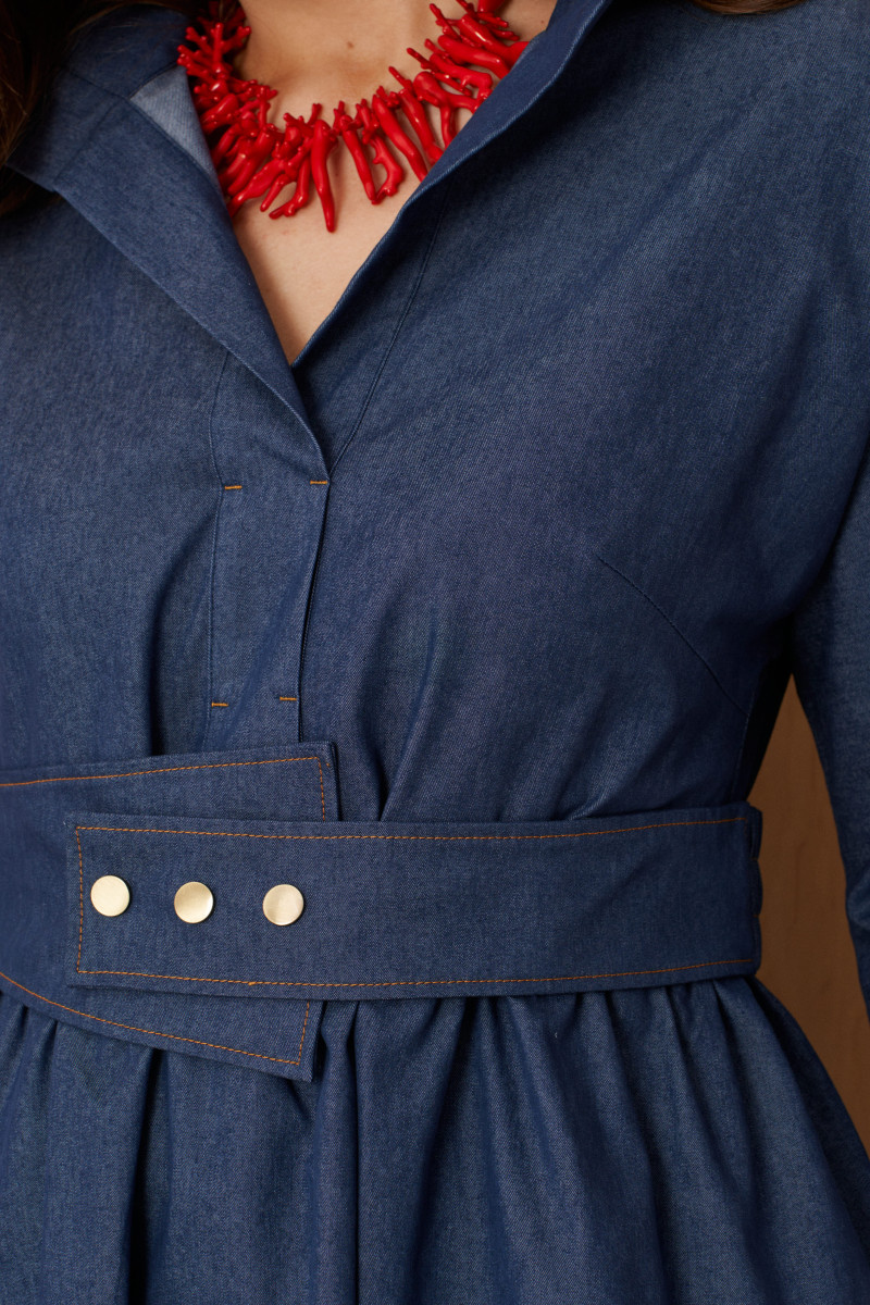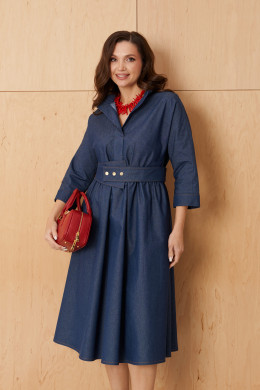 Платье женское из хлопковой ткани для повседневной носки. Платье отрезное по линии талии и имеет небольшую сборку. Перед имеет две нагрудные вытачки, а также дизайнерскую вышивку в виде веточки рябины. В боковых швах располагаются прорезные карманы. Горловина обработана втачной планкой с нахлестом в V-образной горловине, а также воротником-стойкой. Рукава втачные, длиной. ниже локтя. Низ рукава обработан отлетной манжетой. Юбка платья расширенная. Платье укомплектовано поясом из основной ткани изделия. Платье без подкладки. Пояс со вставкой на резинке, застежка на кнопки. Длина изделия миди. Данное платье синего оттенка станет незаменимой вещью в вашем гардеробе, оно отлично будет сидеть и смотреться на любой фигуре.