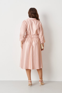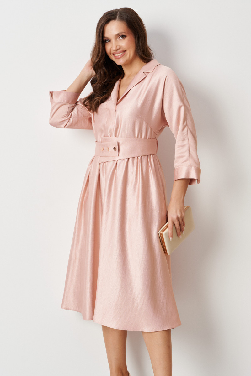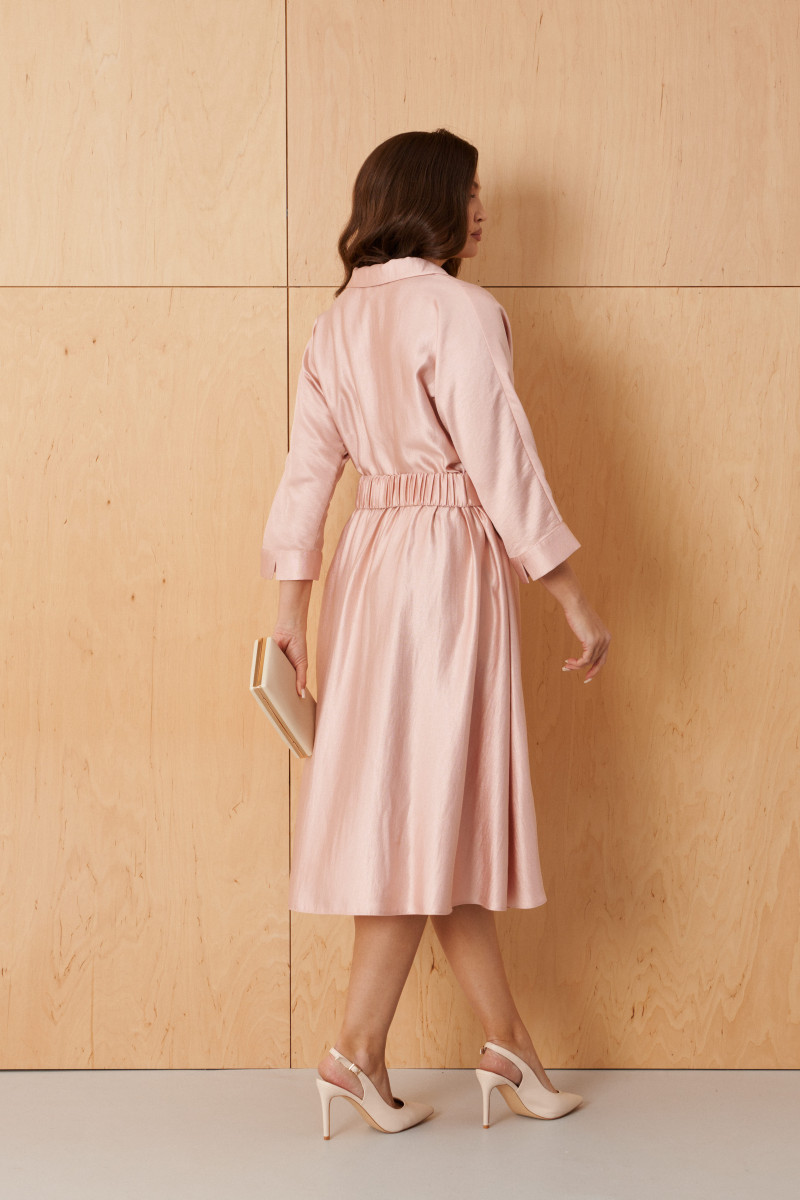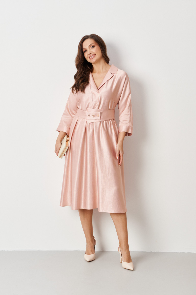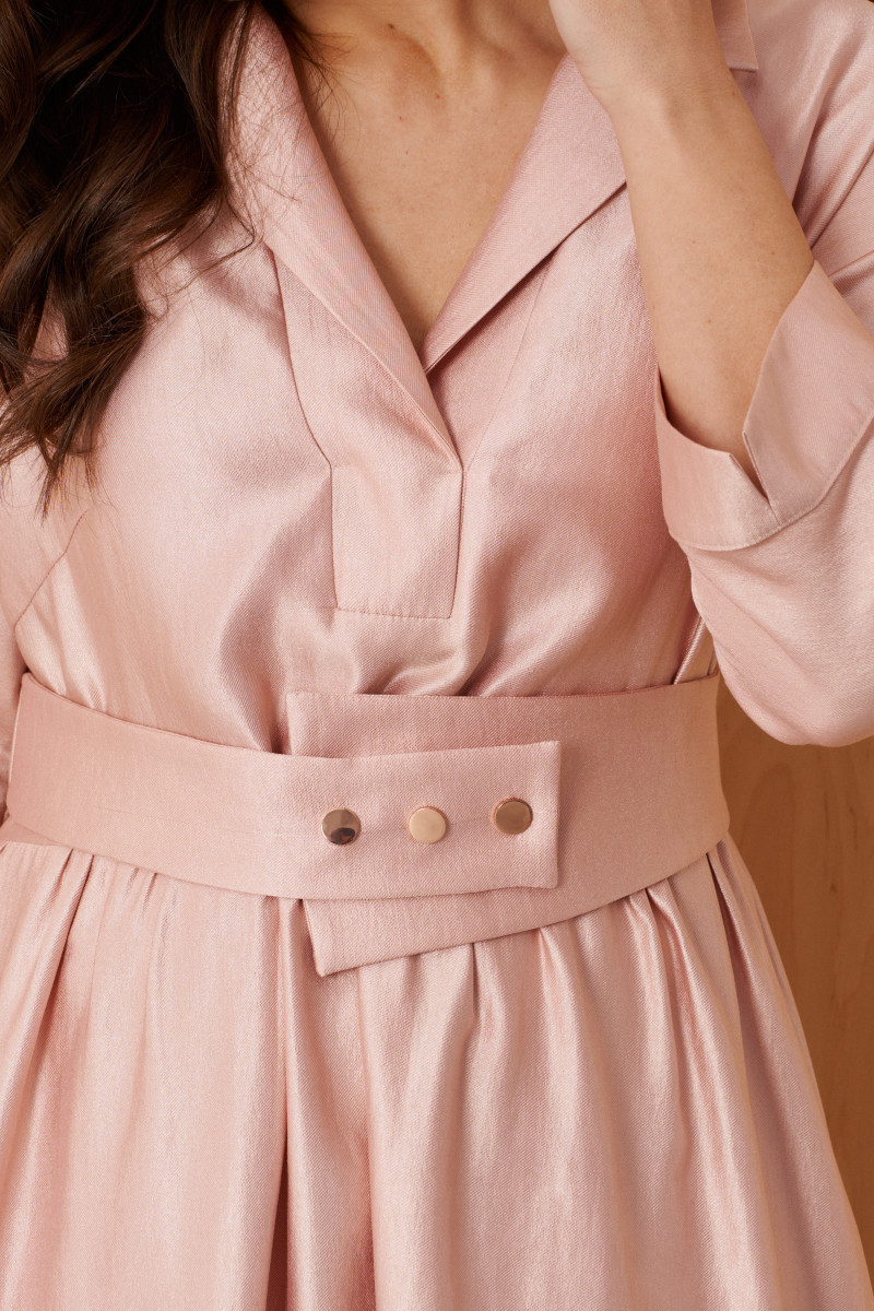 Платье женское из нарядной ткани с блеском с добавлением вискозы. Платье полуприлегающего силуэта. Платье отрезное по линии талии и имеет небольшую сборку. Перед имеет две нагрудные вытачки, а также дизайнерскую вышивку в виде веточки рябины. В боковых швах располагаются прорезные карманы. Горловина обработана втачной планкой с нахлестом в V-образной горловине, а также воротником-стойкой. Рукава втачные, длиной. ниже локтя. Низ рукава обработан отлетной манжетой. Юбка платья расширенная. Платье укомплектовано поясом из основной ткани изделия. Пояс со вставкой на резинке, застежка на кнопки. Без подкладки. Длина изделия миди. Данное платье синего оттенка станет незаменимой вещью в вашем гардеробе, оно отлично будет сидеть и смотреться на любой фигуре.