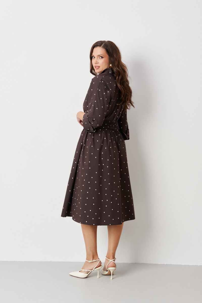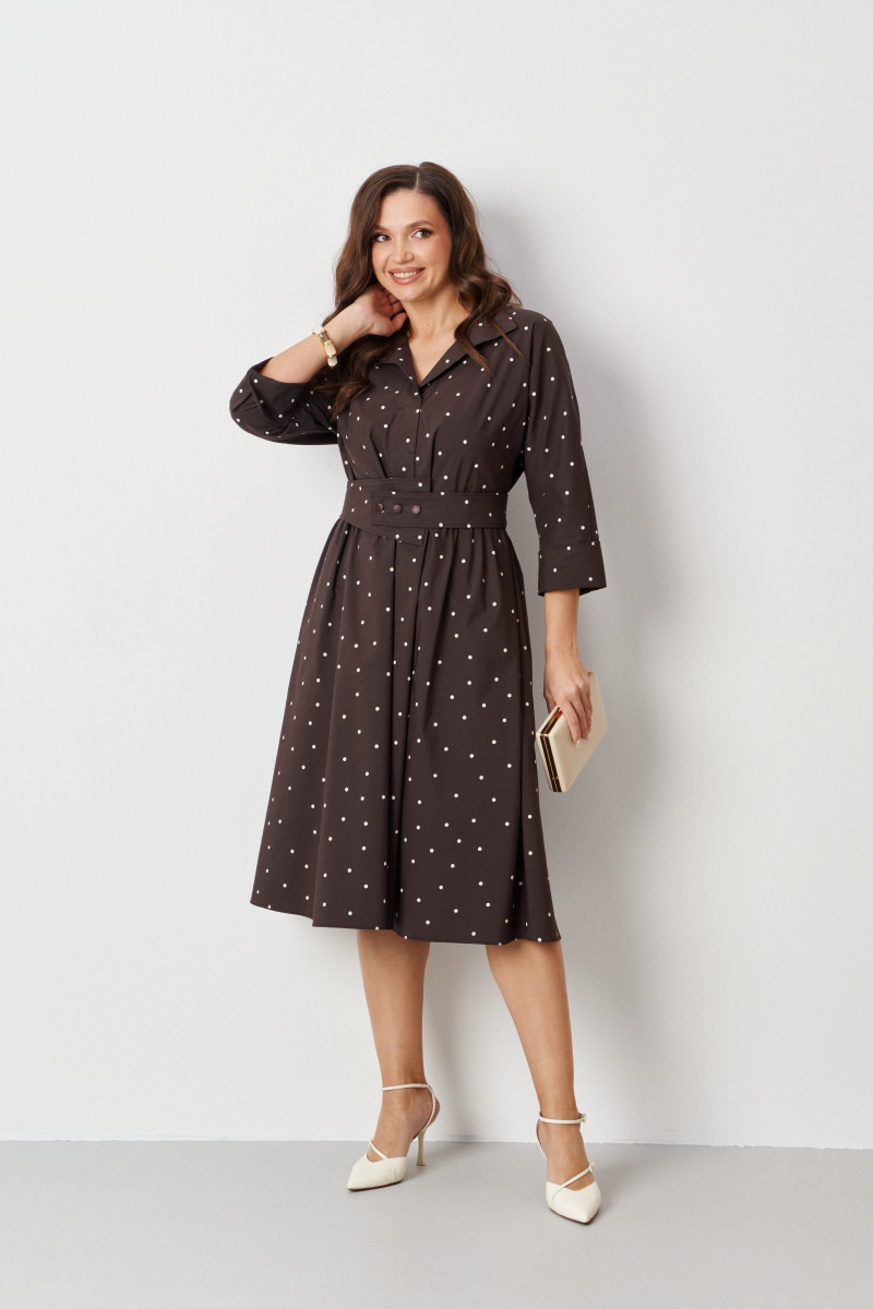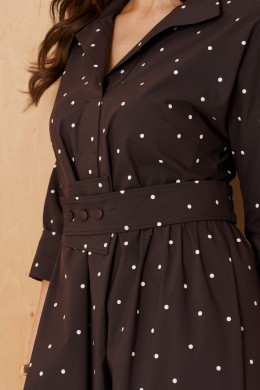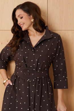 Особенностью этого платья являются прорезные боковые карманы, обеспечивающие практичность. В комплекте пояс из основной ткани изделия, с вставкой на резинке в задней части, что позволяет дополнительно подчеркнуть талию и создать более аккуратный силуэт. Цвет модели — насыщенный коричневый, что делает образ теплым и универсальным.