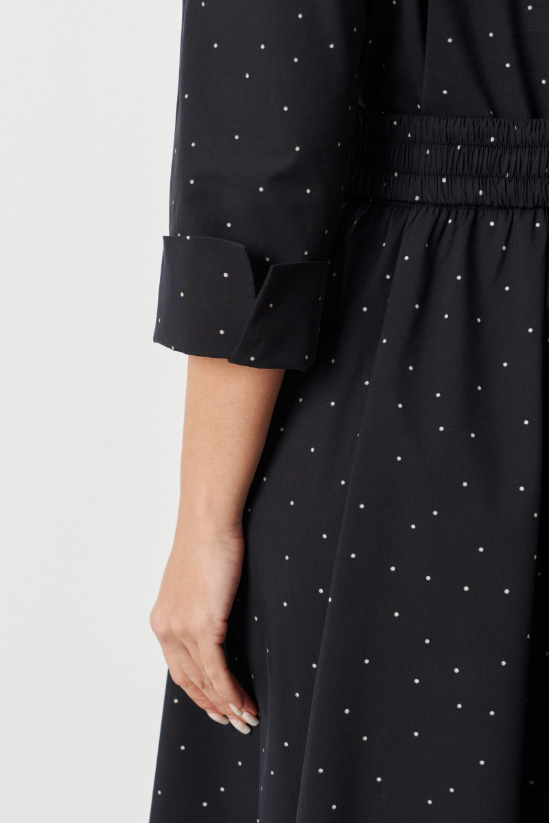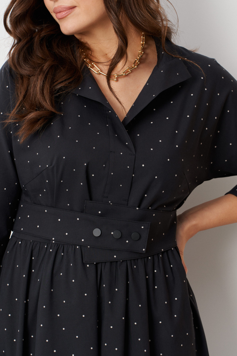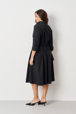 Особенностью этого платья являются прорезные боковые карманы, обеспечивающие практичность. В комплекте пояс из основной ткани изделия, с вставкой на резинке в задней части, что позволяет дополнительно подчеркнуть талию и создать более аккуратный силуэт. Цвет модели — насыщенный чёрный, что делает образ теплым и универсальным.