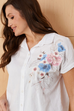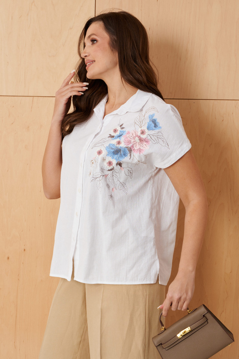 Блузка женская из хлопчатобумажной ткани прямого силуэта для повседневной носки. В блузке имеется центральная бортовая застежка на шесть обметанных петель и шесть пуговиц. В боковых швах имеются небольшие разрезы. Горловина обработана рубашечным воротником с отрезной стойкой. Блузка с цельнокроеным коротким рукавом. Очень легкая и воздушная блузка подарит вашему телу комфорт, а также будет отлично смотреться на вашей фигуре.